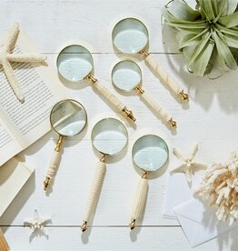 The Tortoise Swirl Magnifier and Letter Opener Set boasts a stunning design that seamlessly blends tortoise swirl resin, brass, and glass